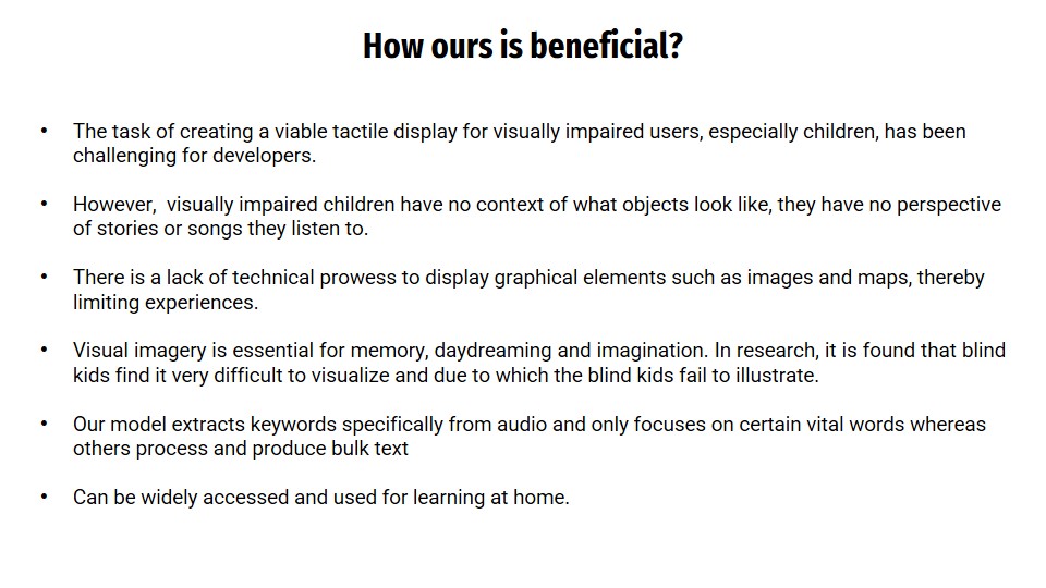 Our product aims to impact children under the age of 10. India alone, is home to over 270,000 visually impaired children. Visually impaired children can enjoy the benefits of visual exploration through tactile graphics. Tactile graphics give instant access to 3D information, such as shape, spaciousness, and depth. Our product, unlike pre-existing tabs, do not print all processed information thereby allowing for a greater understanding, thus more impact. Just as sighted people need to see as many objects as they can to enhance their knowledge of the world, the impaired need to touch as much as they can. Blind children should be given ”an ample opportunity for hands-on exploration and experimentation of objects”. Because they lack the benefits of visual exploration, blind children must be encouraged to learn tactual exploration to create accurate mental images of the world. The exploration can be done with the aid of tactile graphics, which can represent any object in the world.