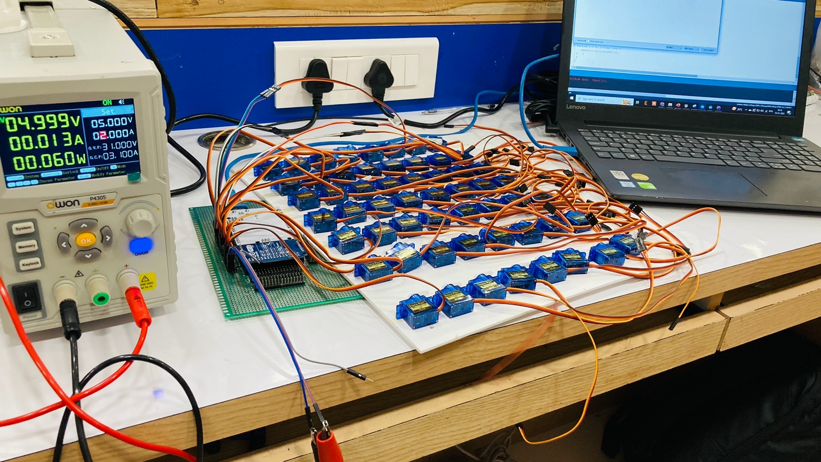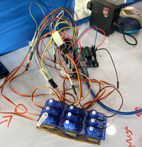 The hardware part of our project comprises of an 8x8 tablet with 64 server (servo SG90) motors. Our tablet works on a SMPS 12V Power supply with a buck boost converter and consists of 64 pins in a pixel-like grid that can quickly be set to be in up or down positions with the help of the motors, forming easily identifiable shapes. These are being controlled by Arduino mega that work on a and have a rod attached to them that move at an angle from 0°-180° thereby reflecting the objects.