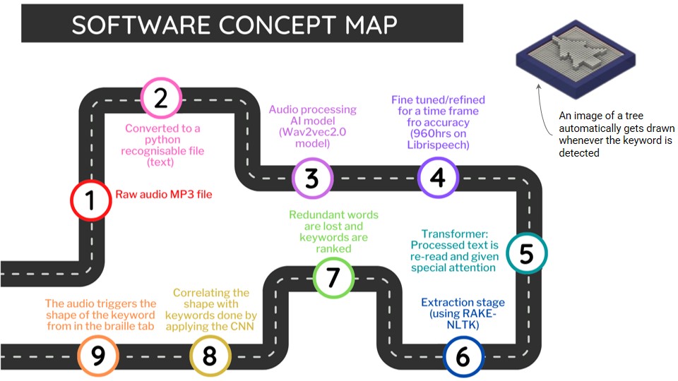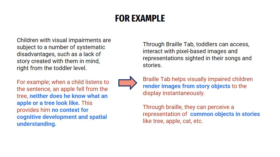 Encouraged by development in haptic technology, we have undertaken ‘Project Braille Tab’ – a prototype that triggers images of keywords extracted from audio. This brings stories and images to your fingerprints in real-time and brings the community one step closer to digital equality. Any keyword extracted from an audio can be made tactile for all users. We have taken great inspiration from children’s rebus stories which essentially, represent crucial words in a story and display it in a pictorial manner. Our model does exactly this but uses raised dots to display a shape or a picture. The Braille Tab is creating the tactile display that pushes through the boundaries and expands the possibilities of digital accessibility.